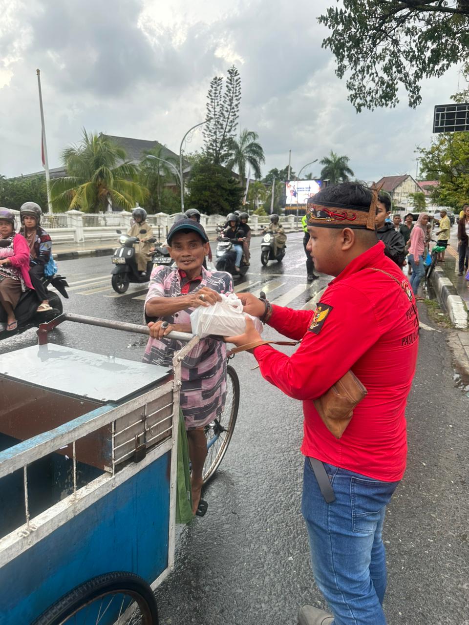 Perkumpulan Pemuda Dayak Banjarmasin yang dipimpin Apri Wilianto menggelar aksi sosial membagikan 100 paket nasi kotak kepada warga kurang mampu.
