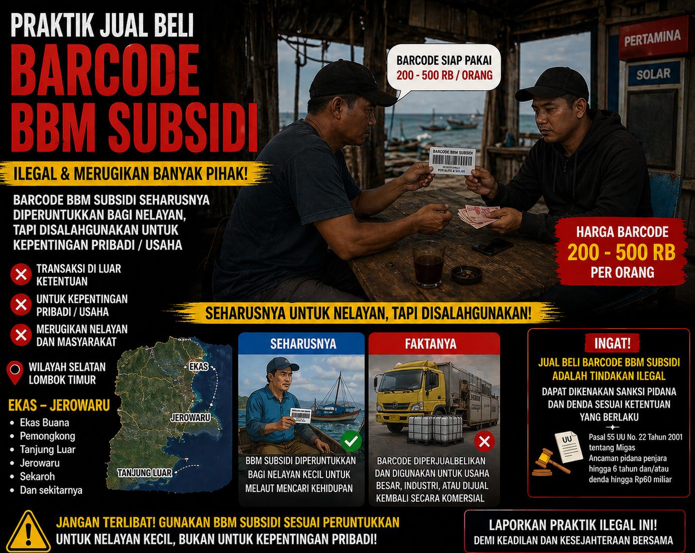 Tak tanggung-tanggung, harga yang dipatok dalam transaksi ilegal ini diduga berkisar antara Rp200.000 hingga Rp500.000 per barcode. Praktik ini jelas menimbulkan keresahan, terutama bagi nelayan kecil yang justru terancam kehilangan haknya atas BBM bersubsidi.