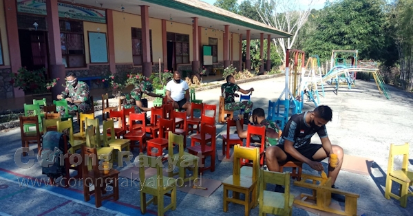 Terkait dengan itu, personel Mako Satgas Sektor Timur sudah satu minggu membantu pengecatan tempat bermain dan perbaikan TK Assisi Onoboi yang terletak di Kelurahan Umanen baik pengecatan mainan anak, halaman, kursi, gerbang dan pemasangan keramik tempat duduk dan bermain anak-anak.