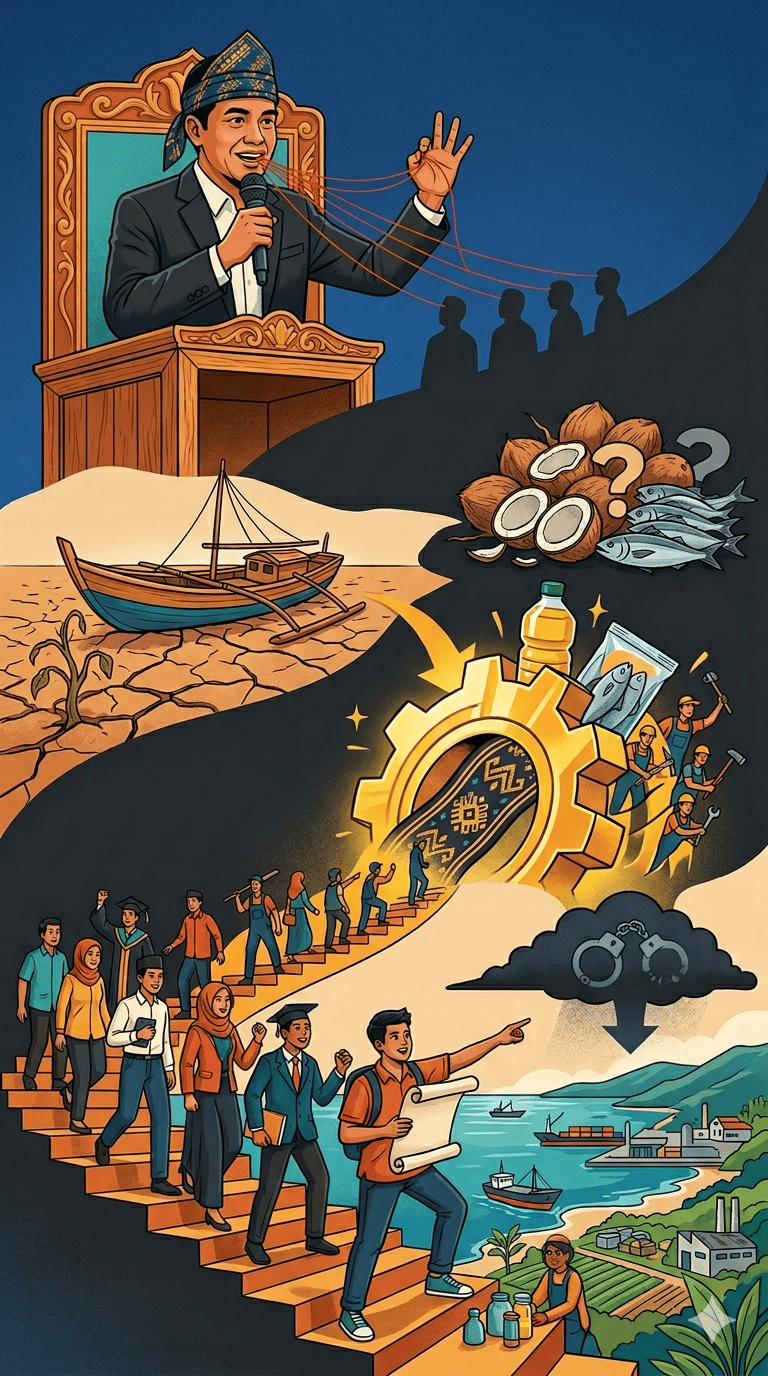 Salah satu langkah strategis yang dapat ditempuh adalah mendorong industrialisasi pada sektor unggulan, seperti pertanian dan perikanan. Selama ini, dominasi penjualan komoditas dalam bentuk mentah menyebabkan rendahnya nilai ekonomi yang diperoleh masyarakat. Dengan pengembangan industri pengolahan, nilai tambah produk dapat ditingkatkan, sekaligus membuka lapangan kerja baru. Dampak lanjutannya adalah penurunan tingkat pengangguran yang secara tidak langsung berkontribusi pada pengurangan angka kriminalitas.