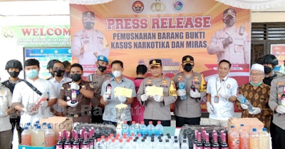 LOMBOK TIMUR, Corongrakyat.co.id- Sat Res Narkoba Polres Lombok Timur lakukan pemusnahan barang bukti berupa puluhan gram narkoba kelas l jenis sabu dan ribuan liter minuman keras (Miras).